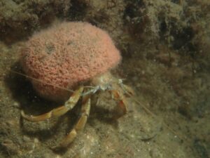 Tijdens het te water gaan bleek al dat de stroming best redelijk was, snel daalde iedereen af om verder onder water uit te zwemmen met de stroming van links was het best lastig om rechtuit richting de Oesterbank te gaan, maar dat lukte iedereen uiteindelijk prima. Eenmaal bij de drop-off werd tegen de stroming in gezwommen en de bodem af gezocht naar o.a. Sepiola’s. Taco was achteraf de enige die er één had gezien, maar daarvoor moest hij wel even in gevecht met het leuke diertje. Wij vragen ons af welke blik Taco had gegeven toen hij dit niet agressieve beestje tegen kwam en dat deze Sepoila in de aanval ging. Waarschijnlijk had hij zich vermomt als Zeewier (zie foto’s).  Verder was het voor iedereen vooral tijdens het deel tegen de stroming in zoeken door de Algenbloei en vele fuiken heen naar was moois. De vele Anjelieren blijven toch een mooi aanzicht en ook de afwisseling tussen Oesters en Anemonen geeft deze duikstek toch wel een sprong naar boven in de lijst van duikstekken, ondanks het zicht. Naast de Sepiola werden veel ruwe Wratslakken en kreeften gezien. Esther en Friso hebben nog enkele Slijmvissen gezien, waar andere druk op zoek naar waren maar deze hebben gemist. Het meest speciale van deze dag was toch wel die duiker die sinds jaren geen volgelaatsmasker op had maar een “gewone” duikbril… leek wel een brilvis 🙂