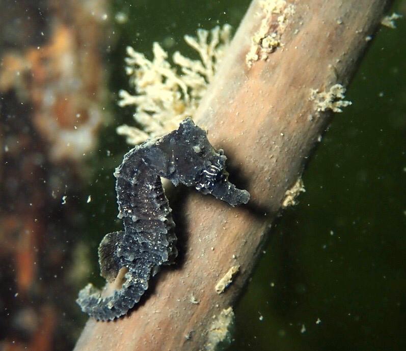 Toen iedereen er was werden buddy paren gemaakt en al snel was iedereen klaar om te water te gaan. Besloten was om links de Sepia stokken goed te onderzoeken of daar het Zeepaardje kon worden gevonden. En ja hoor, al bij de tweede set stokken was het raak…. het Zeepaardje en nog wel een baby ook. Zo’n kleine 2 of 3 centimeter, groter zal hij niet geweest zijn. Nadat iedereen hem op beeld had gezet (foto of video) werd verder gegaan om ook de andere duikers de gelegenheid te geven om hem te bekijken. Later werd ook nog een mooie jonge Sepia, baby Sepia en een Harlekijnslak gezien, buiten al het gebruikelijke natuurlijk, want er was natuurlijk veel meer te zien. Na een uur en een kwartier kwamen ook de laatste duikers met een grote smile op hun gezicht bovenwater.