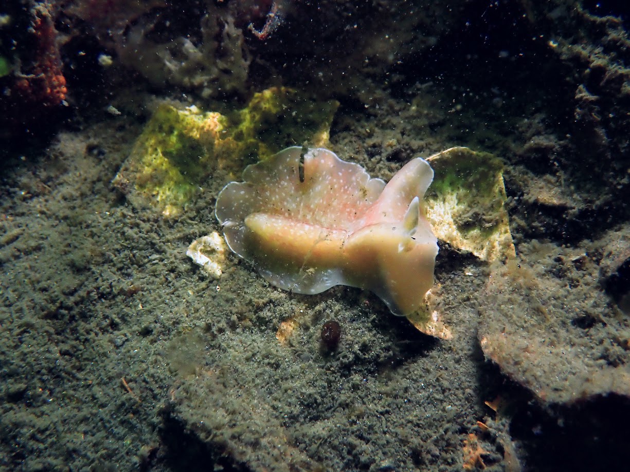 Al vrij snel kwamen we een mooie Oesterbank tegen waarin al best wat leven zat. De krabben schoten alle kanten op als wij met onze lampen op hen schenen. Al struinend over de bodem zochten we naar van alles en nog wat. Een Hooiwagenkrab, Botervis, verschillende soorten wieren. En toen ineens fladderde iets in de lichtbundel van mijn lamp. Een Flamenco platworm. Ik kan nog net Susan waarschuwen zodat zij het ook zag en flop weg was hij. Ergens tussen de Oesterschelpen. Wat een mooi gezicht. Hij lijkt zo echt op een Spaanse Danseres, die ik jammer genoeg nog nooit gezien heb in het echt. Goed tussen de schelpen gezocht en ja, daar was hij. Camera’s erbij gepakt en op beeld gezet. Nadat wij klaar waren Taco geseind, maar die was zelf ook iets moois aan het bewonderen…. Ja hoor nog twee stuks. Ik snapte toen wel dat hij niet zo nodig bij ons hoefde te liggen 😊. Nadat ook van deze foto’s zijn gemaakt zijn we verder gegaan. Niet veel later kwamen we op een zandvlakte terecht waar eigenlijk weinig te zien was op een Slib Anemoon en huisjesslakken na.