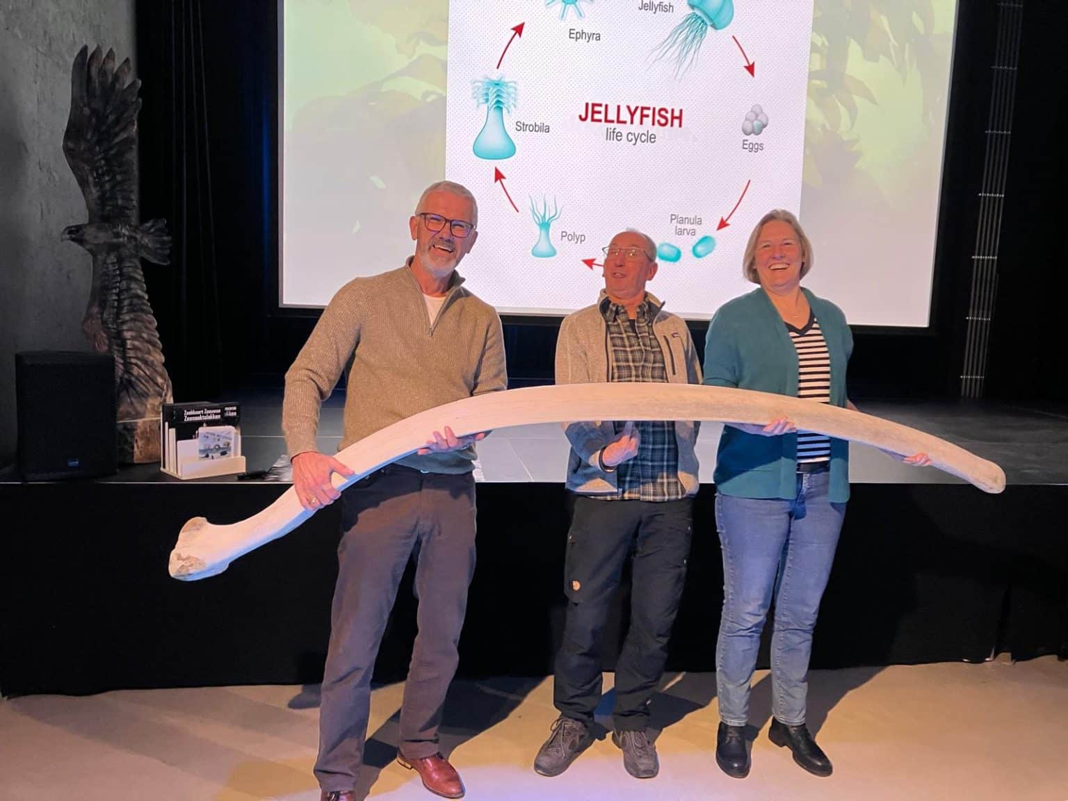 Dit is niet het enigste dat Bas onderwater is tegen gekomen. Dit is ook de man die de eerste walvisbalein heeft gevonden en geborgen bij de Zeelandbrug. Als ik het goed begrepen heb, wordt het binnenkort via DuikeninBeeld naar buiten gebracht. Maar hier vast een voorproefje. Een museum dat verhuisd. Baleinen die vergeten worden en blijven liggen op een liftschacht. Iemand die ze meeneemt naar huis, waar ze 30 jaar achter de bank hebben gestaan. Iemand die er vanaf wil, maar het zonde vindt als het venietigd wordt. Wat doe je dan? Hoe krijg je legale papieren hiervoor? Nou je kiepert ze van de Zeelandbrug af in de hoop dat duikers ze vinden en ze daardoor gelegaliseerd kunnen worden. Het verhaal in een notedop. Bizar en hilarisch. Ter afsluiting van deze verassende lezing, moesten we toch even met die balein van 20! kilo op de foto.