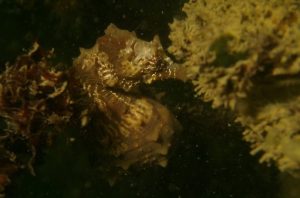 Na dit geklungel hebben we onze sets omgehangen en zijn we richting het water gegaan. Gelukkig is deze stek zo dat we geen dijk over hoeven dus we stonden zo tot onze buik in het water. Rustig aan zijn we verder gelopen tot we in dieper water stonden. Hier hebben we de vinnen aangedaan en nog wat laatste controles. Eenmaal zover hebben we ons laten afzinken tot de zandvlakte. Even rustig gelegen en gevoeld of alles goed zat en na het ok signaal van ons beide zijn we begonnen aan onze tocht richting het Oester rif. We hoefde niet lang te zoeken want al gauw werden we verwelkomt door rode en groene wieren, oesters en diverse krabbetjes en kleine visjes. Het zicht was goed en zeker 5 meter. Rustig aan verder afdalend richting de diepte verdwenen langzaam de wieren en werden ze vervangen door diverse sponsen die hier en daar tussen en aan de oesters zaten. Je kunt merken dat het de temperatuur daalt want ook het leven wordt minder op het rif. Wel hebben we nog een paar kreeften gespot. Van klein tot behoorlijk groot. Echt diep kan je hier niet en ook vandaag zijn we maar maximaal op 6 meter geweest. Na 30 minuten zijn we gedraaid en langzaam weer richting de kant gegaan.