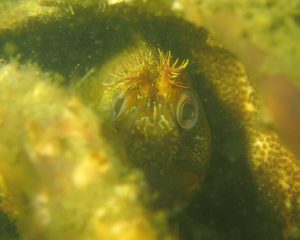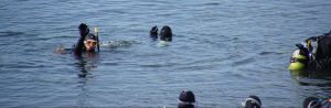 Na enkele minuten zwemmen waren we aangekomen bij de hangcultuur. Voordat wij afdaalde zagen we nog enkele vinnen van Taco en Susan die wel even onderwater richting de hangcultuur zouden duiken…. Samen met Joke en Lex ben ik afgedaald om, zoals afgesproken, 20 minuten heen en 20 minuten terug langs de hangcultuur te duiken. Het zicht was echt super, zeker 5 meter zicht en op een maximale diepte van 12 meter keek je zo naar boven langs de hangcultuur. In en rond de hangcultuur is volop leven. Diverse soorten krabben en kleine Noordzee krabben zijn te bewonderen. Maar ook Spookkreeftjes, Botervisjes en Zeedonderpadjes.