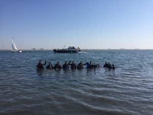 We hadden om 11.00 afgesproken maar door drukte op de weg werd het half twaalf, na een heerlijk kopje koffie / cappuccino gingen we inchecken aan de balie, na de leuke groepsfoto direct omkleden. Met de lift naar boven, daar aangekomen de setjes opbouwen en met z’n allen onder water. We hebben alle objecten bekeken en genoten van alle mooie vissen (het worden er steeds meer en ze groeien echt) en het zicht. Na een klein uur zat de duik er weer op en kwam een ieder weer boven. Na gedoucht en omgekleed te zijn, met z’n allen gezellig in het restaurant bijgekletst en wat gedronken, hierna ging een ieder naar huis, na eerst nog wat snacks te hebben genuttigd in het frietkot met Richard en Jeffrey.