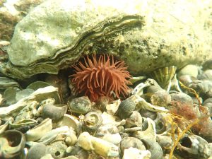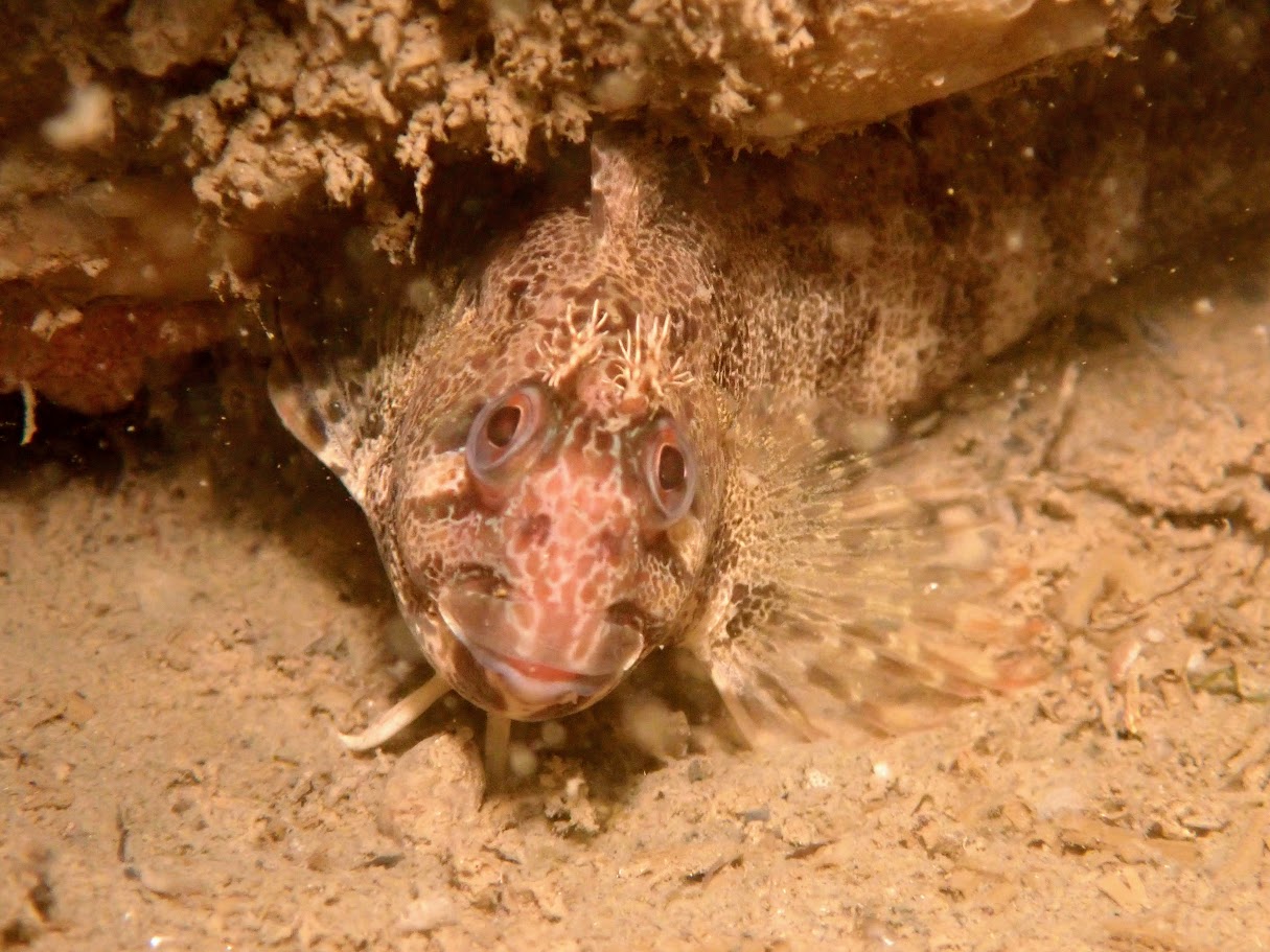 Terwijl wij rustig te water zijn gegaan en in het water onze laatste spullen goed deden kwamen volgens mij alle andere duikers achter ons aan. Lex en ik zijn even wat weggezwommen en buiten de drukte afgedaald. Wij zaten al snel op 4 meter diepte. Het zicht was daar prima. Al duikend zijn wij telkens iets dieper gegaan. Soms moesten wij ons even vasthouden of tegen de stroming in zwemmen om het onderwater leven te kunnen bekijken of op beeld te kunnen zetten. Als Lex wat zag dan wachtte ik even totdat hij klaar was met zijn opname en dan kon ik rustig mijn foto maken. Soms was het weer andersom. Omdat wij heen met de stroming mee doken moesten wij goed in de gaten houden dat we ons niet te veer mee lieten drijven. Er was veel te zien tussen alle Zee Anjelieren, Weduwrozen, Dodemansduimen en Ruwe Wratslakken. De krabben waren druk bezig met het eten van soms grote Bloemkoolkwallen. Tussen de Oesters zagen wij regelmatig een jonge Zeedonderpad.