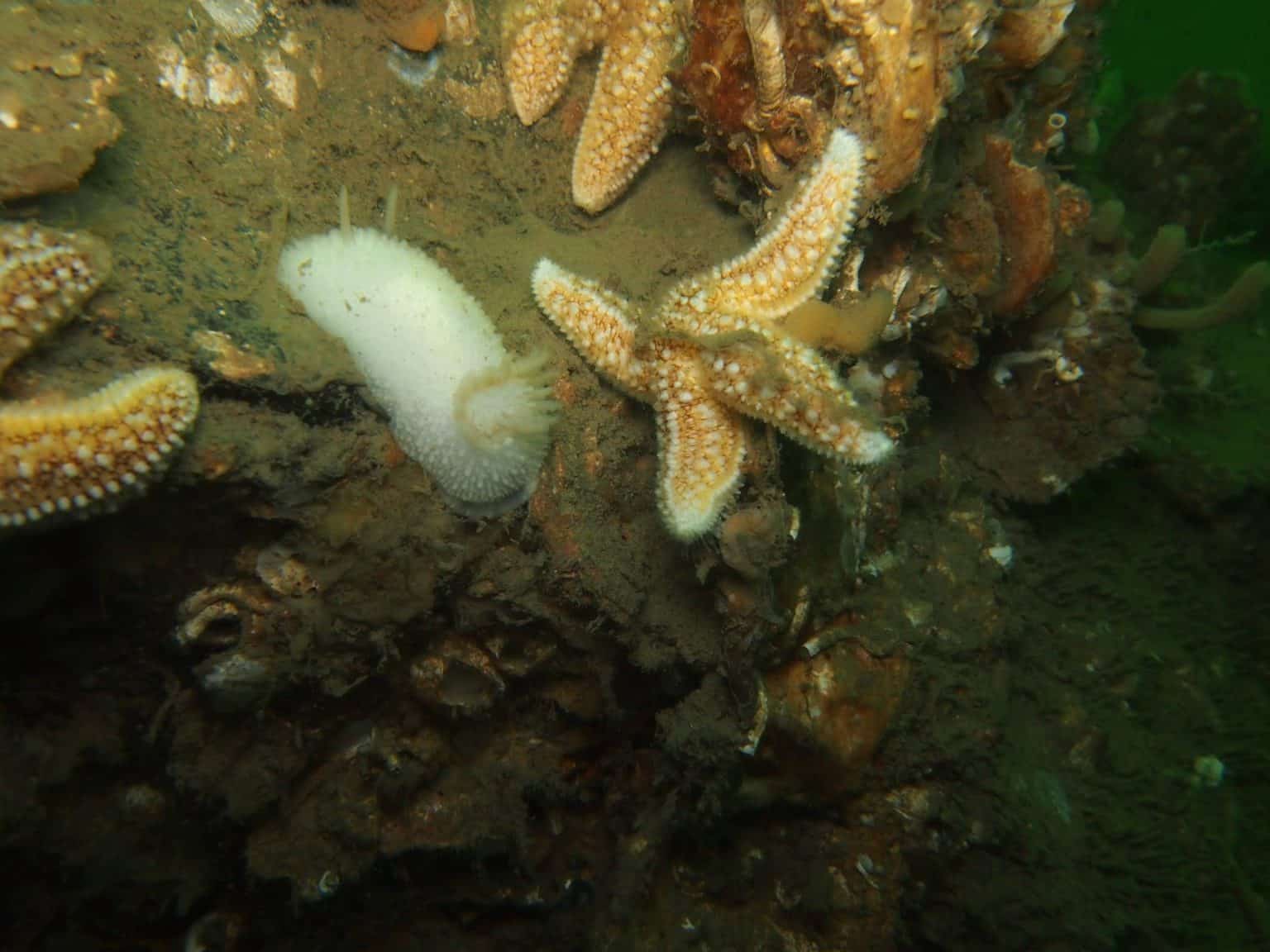 Het doel van vandaag was de Rosse Sterslak. Volgens Esther zaten ze rond de 12 tot 15 meter diep. Om daar te komen hoef je bij Den Osse alleen maar vanuit de steiger rechtdoor te gaan. Zodra we onder gingen werden we getrakteerd op mooie rode wieren met daar tussen krabjes en garnalen, het zicht was super soms wel 5 tot 8 meter. Met lokaal hier en daar wat stofwolken. Eenmaal op diepte aangekomen was het niet lang zoeken. Wat een grote eierstrengen leggen deze slakjes. Daar tussen en omheen zaten de slakjes soms een hele hoop op elkaar. Rustig aan hebben we een hoop op de foto en film gezet. Na een 35 minuten gaf Susan aan dat ze nog op 100bar zat en graag richting de kant wilde gaan. Na 50 minuten kwamen we net naast de steiger weer boven.