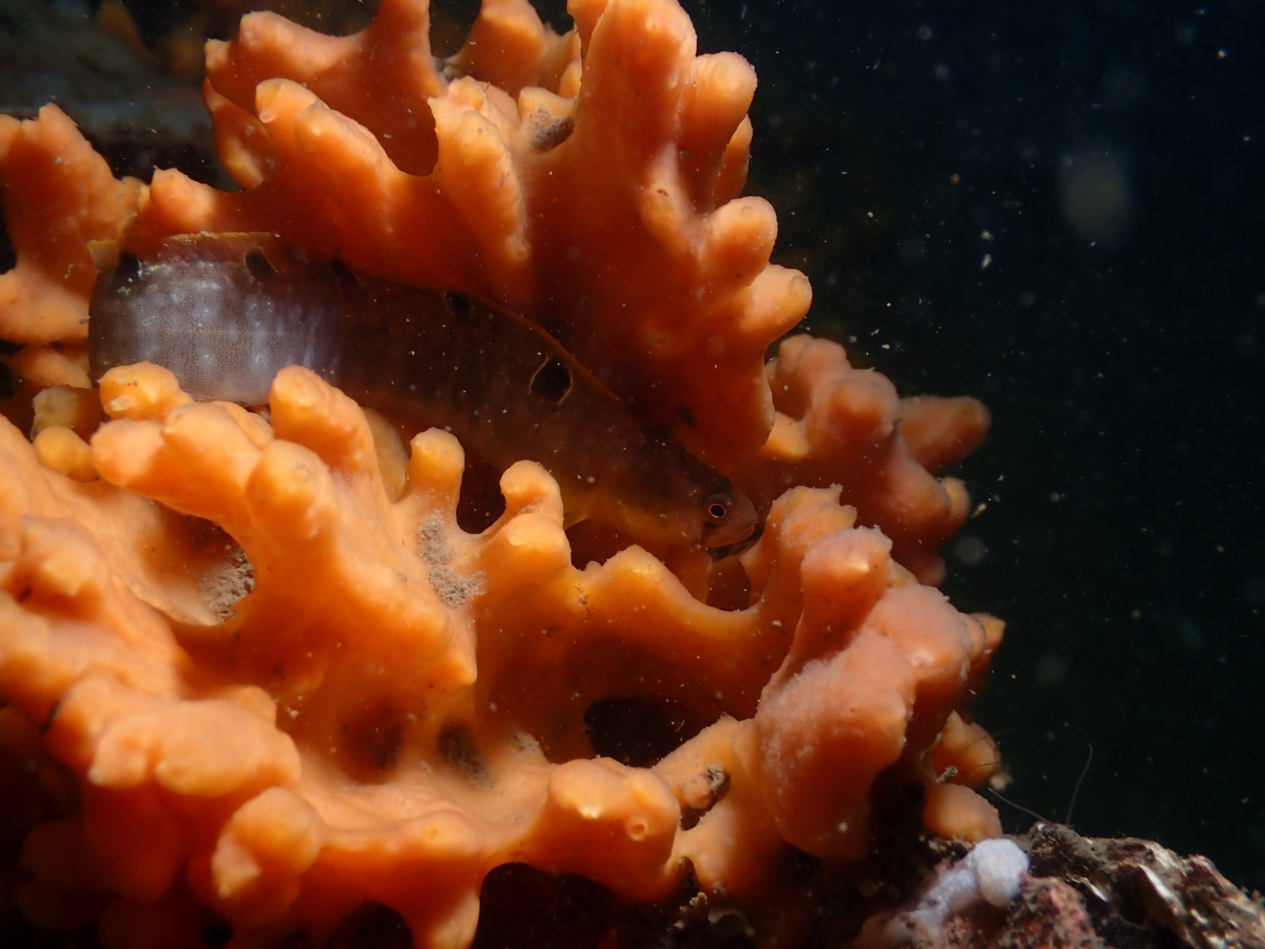 Eenmaal aangekomen bij het water werden de laatste spullen goed gedaan en werd afgedaald in het zeer heldere water. Rustig duikend over het rode wier, waartussen zich veel Groene Wierslakken bevonden, richting de wand om daar weer verder af te dalen naar een meter of 10. Er was gekozen om na de wand naar links te gaan en de duikers hadden gelijk, wat een zicht! Zeker tussen de 5 en 10 meter. Al snel werd een kreeft gespot die zich liet zien met de scharen vooruit, hij zou niet de laatste zijn. De kreeften waren niet op vier handen te tellen. Ook waren er nog veel groten garnalen, Botervisjes. Na veertig minuten werd gedraaid en het ondiepere water gekozen om zo duikend de safty-stop te maken. Tussen de Oesters werden diverse Zeedonderpadden gezien en op de zandvlaktes tussen de Oesterbanken werden enkele Noordzeekrabben gezien die zich half in het zand hadden verstopt. Weer terug bij de instap werd de laatste Zeedonderpad gezien, dit was er één die je niet vaak ziet! Een zwart/witte Zeedonderpad, een mooie afsluiting van een heerlijke duik. Wat iedereen wel opviel is dat er steeds meer sponsen zich in de Grevelingen bevinden. Eenmaal bij de auto’s aangekomen kwam het water ook uit de hemel. Ondanks dat werd alles rustig afgebouwd en opgeruimd om daarna in de kleedruimte de droge kleding aan te trekken. Daar was het trouwens een drukke boel met alle duikers die zich ontdeden van hun duik pakken. Na de duik werd er nog na gepraat in de droge omgeving van “Even Pause”, waar ook werd genoten van de lunch. Nog even wat tips en aanwijzingen gegeven aan een duikgroep uit het Noorden die richting Bergse Diepssluis wilde om daar te gaan duiken met enkele nieuwe 1 sters duikers. Hiermee moeten ze de Zeepaardjes wel kunnen vinden.