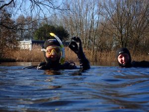Vandaag 9.30u zoetwaterduik Reeuwijkse Plassen: Met z’n drieën bij ‘t bandenspoor te water gegaan. Helaas voor thuisblijvers….