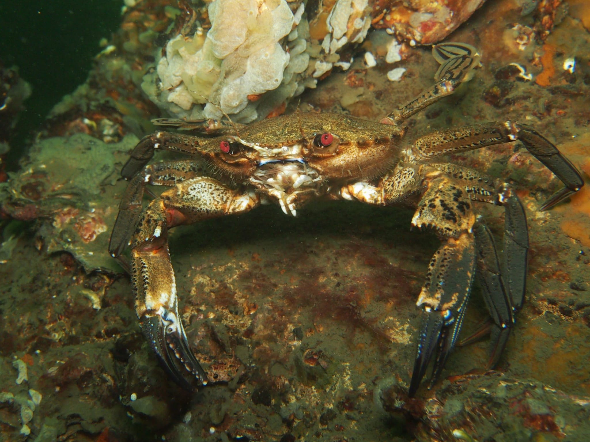 Taco heeft voordat hij zelf zijn spullen omdeed mijn setje alvast bij de duiktrap gebracht en toen we allemaal klaar waren zijn we de trappen gaan beklimmen. Met een droogpak is het toch een zwaardere beklimming als met een natpak, maar sommige duiken het gehele jaar in een droogpak en maken dus ook deze toch in het warme weer….. Eenmaal met zijn alle aangekomen bij de trappen van de steiger, die erg glad waren, zijn de laatste spullen goed gedaan om vervolgens met zijn alle onderwater te verdwijnen. Omdat het zo rustig was en het zicht goed leek hadden we afgesproken om richting de Reefballs te gaan… Het is zeker 6 jaar geleden dat ik daar heb gedoken. Taco ging ons voor en na enkele minuten kwamen we al de eerste Reefball tegen. Daar hebben we lekker rond gesnuffeld en foto’s gemaakt, natuurlijk hebben we elkaar wel in het oog gehouden. Uiteindelijk kwamen we bij de laatste Reefball en zijn we op zoek gegaan naar de Zeedahlia én… Gevonden! Hierna zijn we lekker verder gaan duiken en hebben onderweg nog enkele loslopende Kreeften op beeld gezet. Na een half uur hadden we even overleg over wat te doen en toen gaf Taco aan dat zijn droogpak handschoen lek was, maar dat hij geen kou had. Ondanks dat zijn we na een kleine veertig minuten toch weer om gedraaid en op ons gemak terug gedoken. Tijdens de terugweg kwamen we nog enkele Zeenaalden en losloppende Noordzeekrabben tegen.
