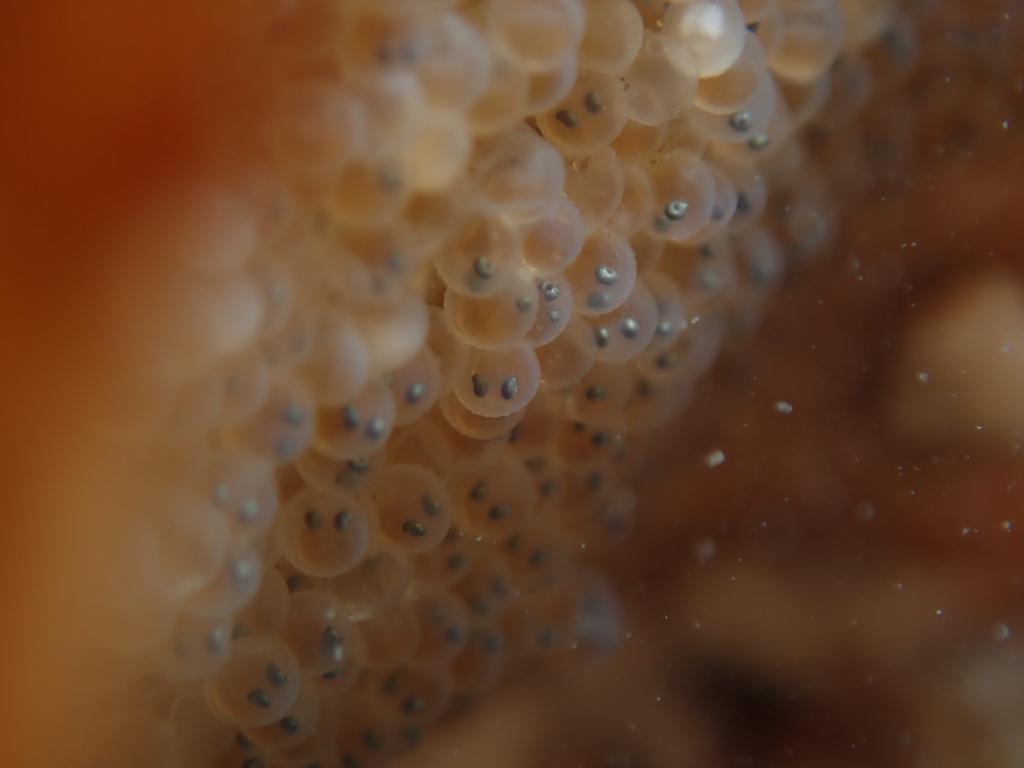Op een diepte van een meter of acht werd heen gedoken en terug op een meter of zes. Het is duidelijk dat het water weer warmer wordt, waardoor er weer meer leven te zien onderwater. Veel mooie sponzen, hooiwagen krabben, grote kreeften. Ook vandaag werd er weer een Harlekijnslak gezien, maar het toefje op de taart was toch wel de het dubbele Zeedonderpad nest. Rode en witte eitjes. Na een klein uurtje was iedereen weer veilig bij de duiktrap om de tocht richting de auto’s weer te maken.