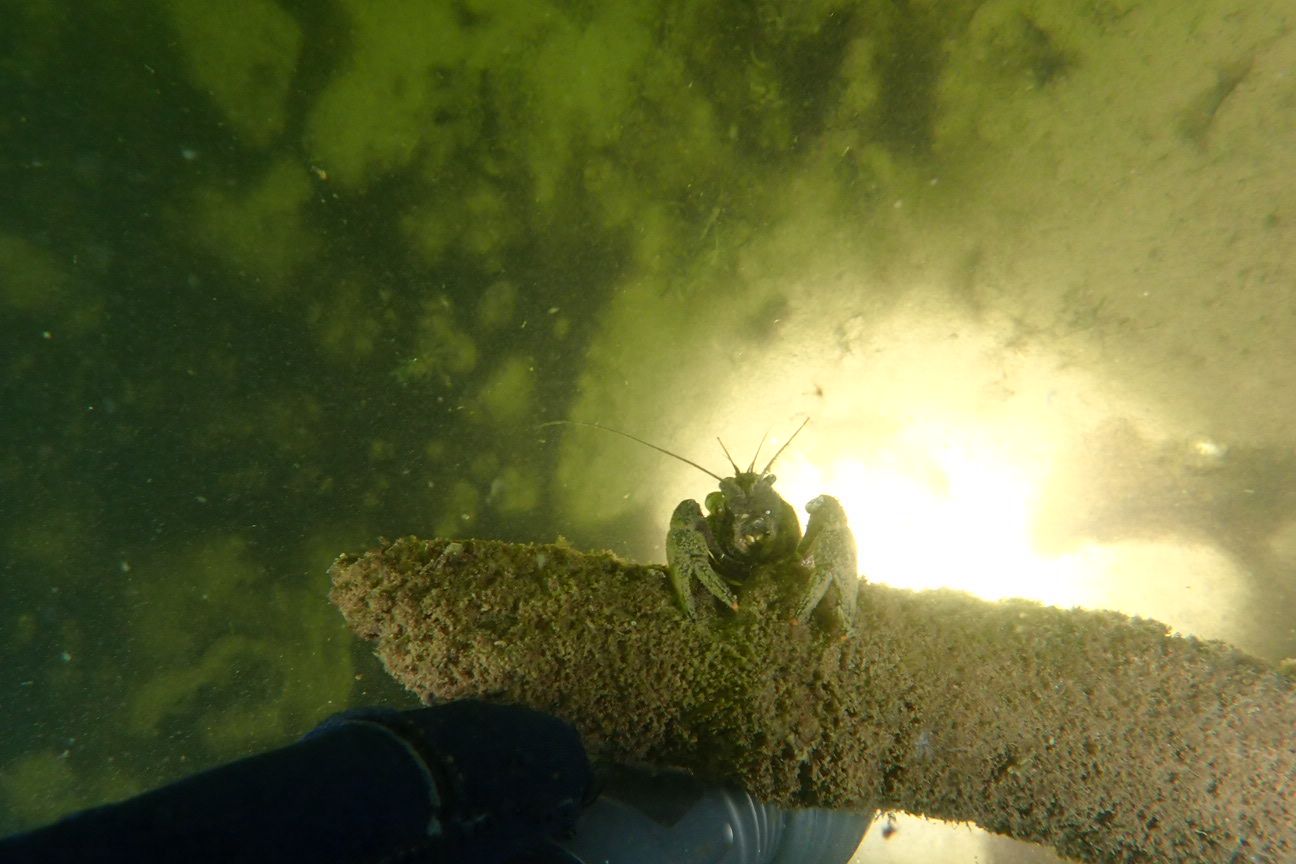 Onderweg wel verwelkomd… hoewel… erg vriendelijk keek deze niet met vergroting van het beeld… door een Rivierkreeft. Blikjes bier en cola mochten wij zien; een bandenspoor; restanten van een metalen boot’bumper’… Soms kort volledig het zicht kwijt en veilig tussen de dames als sandwich beleg rustig verder gezwommen met de verwachting op verbetering wat snel weer kwam.