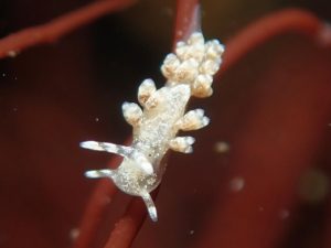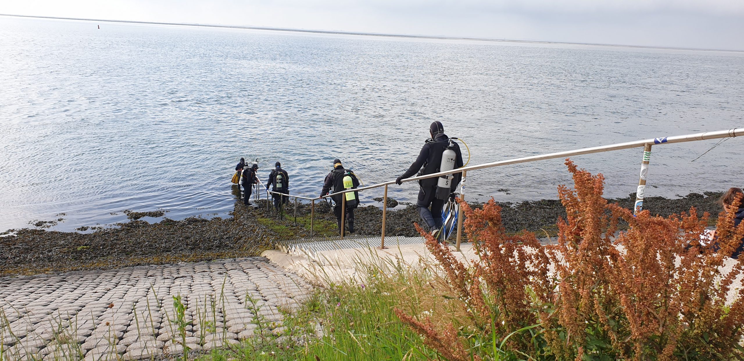 Eenmaal daar aan gekomen en de setjes opgebouwd ging iedereen te water. We kwamen er al snel achter dat de het hard stroomden terwijl we wel rond de kentering doken. Er werd door de meeste buddyparen besloten dat er een beetje tegen de stroming in gevind zal worden en je wel mee te laten voeren door de stroom maar niet helemaal te driften om dat er anders wel een kans was dat je bij de Burghsluis uit kwam en daar gingen we niet duiken 😅. Onderweg zagen we veel moois waaronder grote anemonen die zich te goed deden aan de kwallen. Jos en Mario zagen zelfs nog een Gehoornde Steenslijmvis. Terwijl Friso en Lex op een knoeppert van een Zeedonderpad belanden zijn kop was zo groot als een hand. Taco was mediatief aan het ontspannen. Toen eenmaal de stroming wat rustiger werd en hij rustig draaide scharrelde iedereen over de bodem terug naar de instap plek waar we allemaal nog even werden begroet met een onderwater zandstorm die het zicht beperkte tot ongeveer 10 cm. Een mooi moment om de trap op te zoeken en na 60 minuten weer boven te komen. Waar we werden opgewacht door wel 3 kantkwallen.