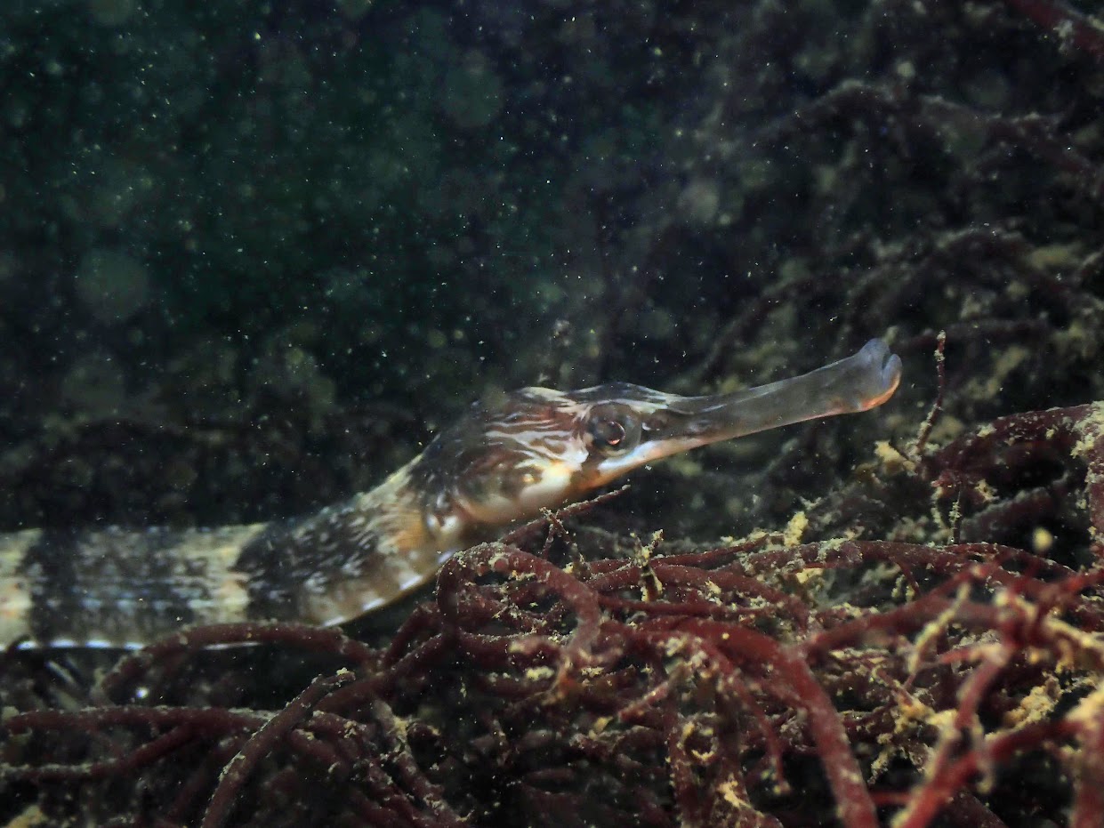 Toen wij te water gingen kwam de groep met cursisten terug van hun eerste duik en werd even gedag gezegd om vervolgens onderwater te verdwijnen. Zoals bij de briefing besproken werd onderwater uitgezwommen om vervolgens bij de wand af te dalen naar een meter of 8 á 9 en naar links te gaan. Op diepte was niet heel veel leven op krabben en enkele Zeenaalden na. Het doel van deze duik lag ook niet op diepte, maar in het deel waar we op de terug weg langs kwamen… Tussen alle mooie Oesters werd gezocht naar Wasrozen. Het schijnt dat er meerdere zouden liggen. Dus werd de bodem grondig afgezocht naar deze mooie Anemonen. Net voor de paal waar ze de afgelopen jaren ook werden gezien, maar dan 2, lagen er 3 bij elkaar op een meter of 4 á 5. Door het matige zicht (was stoffig wit) was het lastig om mooie foto’s te maken. Iets verder, onderaan de paal zat er nog 1. Missie geslaagd zeggen ze dan toch? Niet helemaal, wand de Japanse Zeepbelslakken werden niet gevonden.
