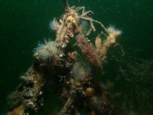 Terwijl de spullen werden klaar gemaakt, werden de buddyparen bepaald en het duikplan besproken. Dat laatste was niet een moeilijke… Te water, afdalen, onderwater uitzwemmen, oude dijk over vervolgens verder af te dalen en richting het gemaal te duiken. Afgesproken was om een uurtje te duiken. Dat leek iedereen ook wel verstandig omdat de temperatuur van het water de afgelopen week 2 graden is gedaald. Zelf had ik wat moeite met klaren nadat ik na de oude dijk verder wilde afdalen. Geduldig stapje voor stapje verder afgedaald en dan ineens gaat het allemaal weer makkelijk. Ook het lichaam moet soms even wennen aan een situatie en dat moet je niet negeren. Rustig zijn we langs de mooie oesterwand gedoken richting het gemaal. Tussen de Oesters is volop leven.