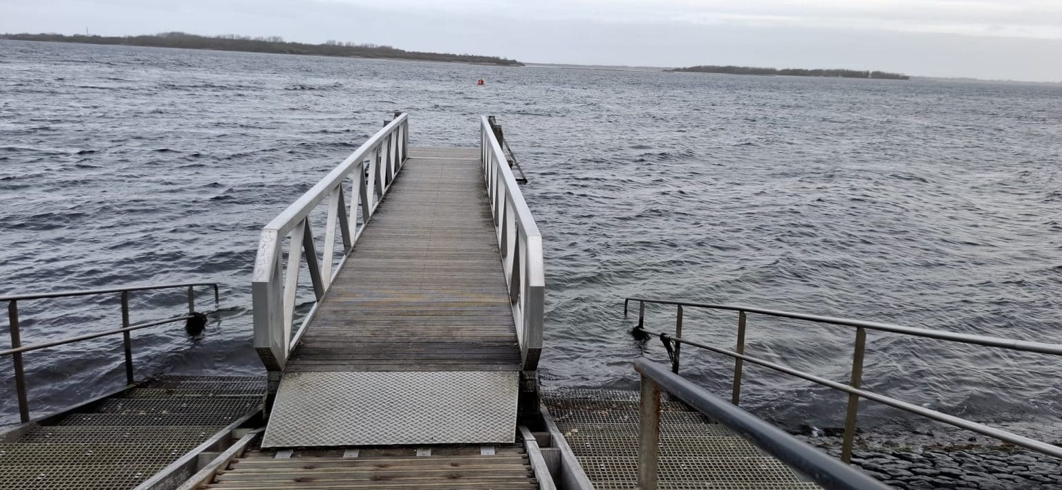 Bij de nog stille en hernieuwde parkeerplaats werd eerst de duikinstap bekeken. Geen golven over de steiger, dus… geen geweiger! En anders… dan toch.